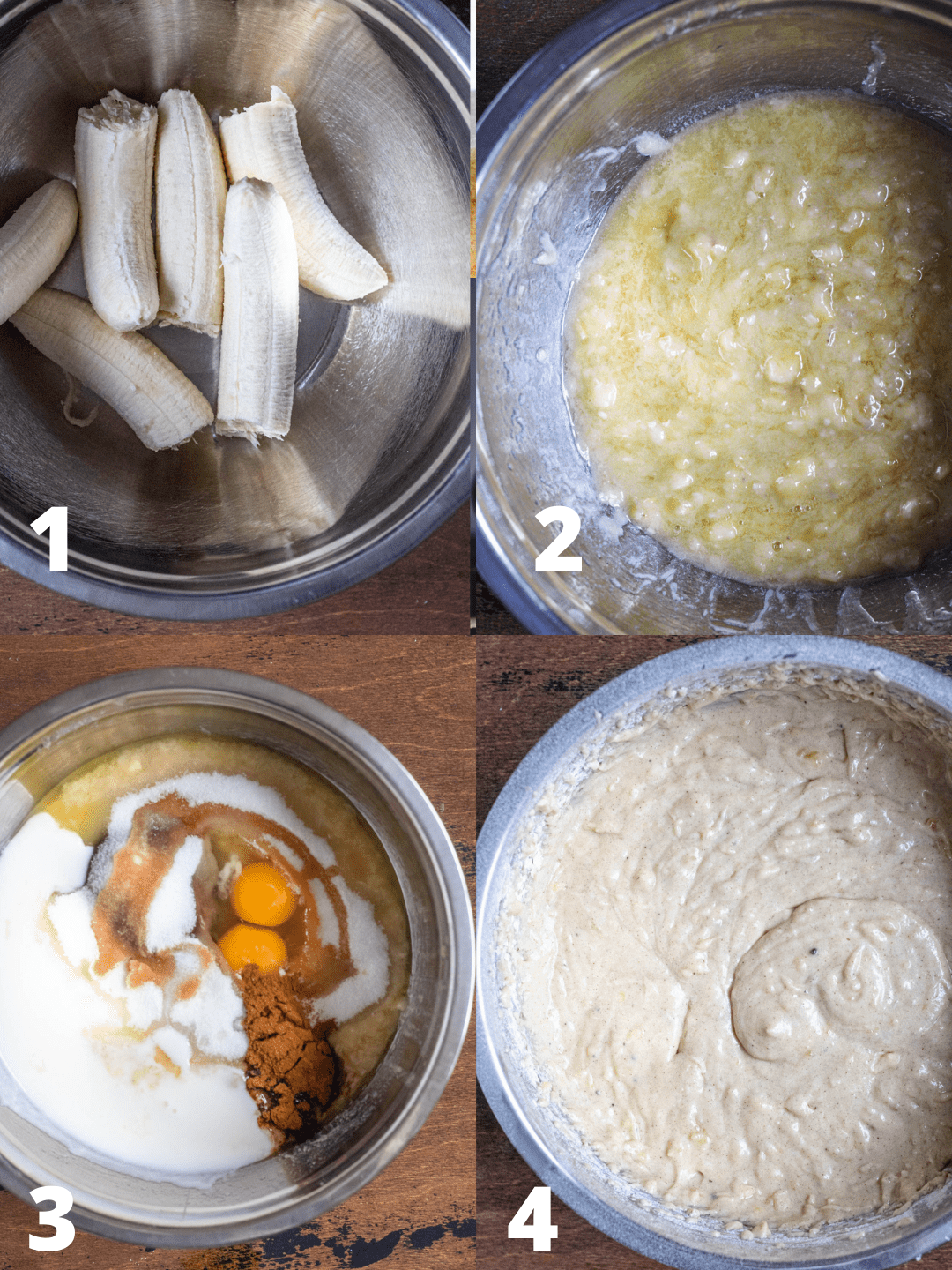 · whisk eggs in a bowl and mix in the bananas.