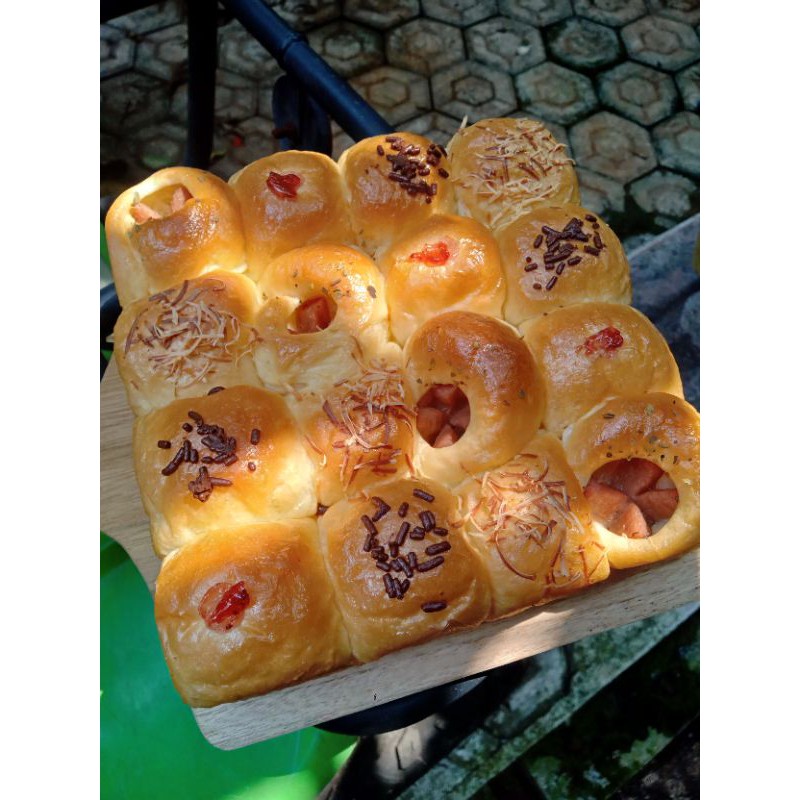 Tepung terigu protein tinggi (cakra)•kuning telur•gula pasir•susu bubuk full cream•ragi instan•garam•air•mentega / . Tuangi air dan kuning telur, uleni hingga . Istirahatkan 15 menit lagi, lalu dibentuk dan diberi isi. dalam wadah, campur tepung terigu, gula pasir, susu bubuk, ragi instant, aduk rata. Dalam wadah, campur tepung terigu, gula pasir, susu bubuk, ragi instant, aduk rata.